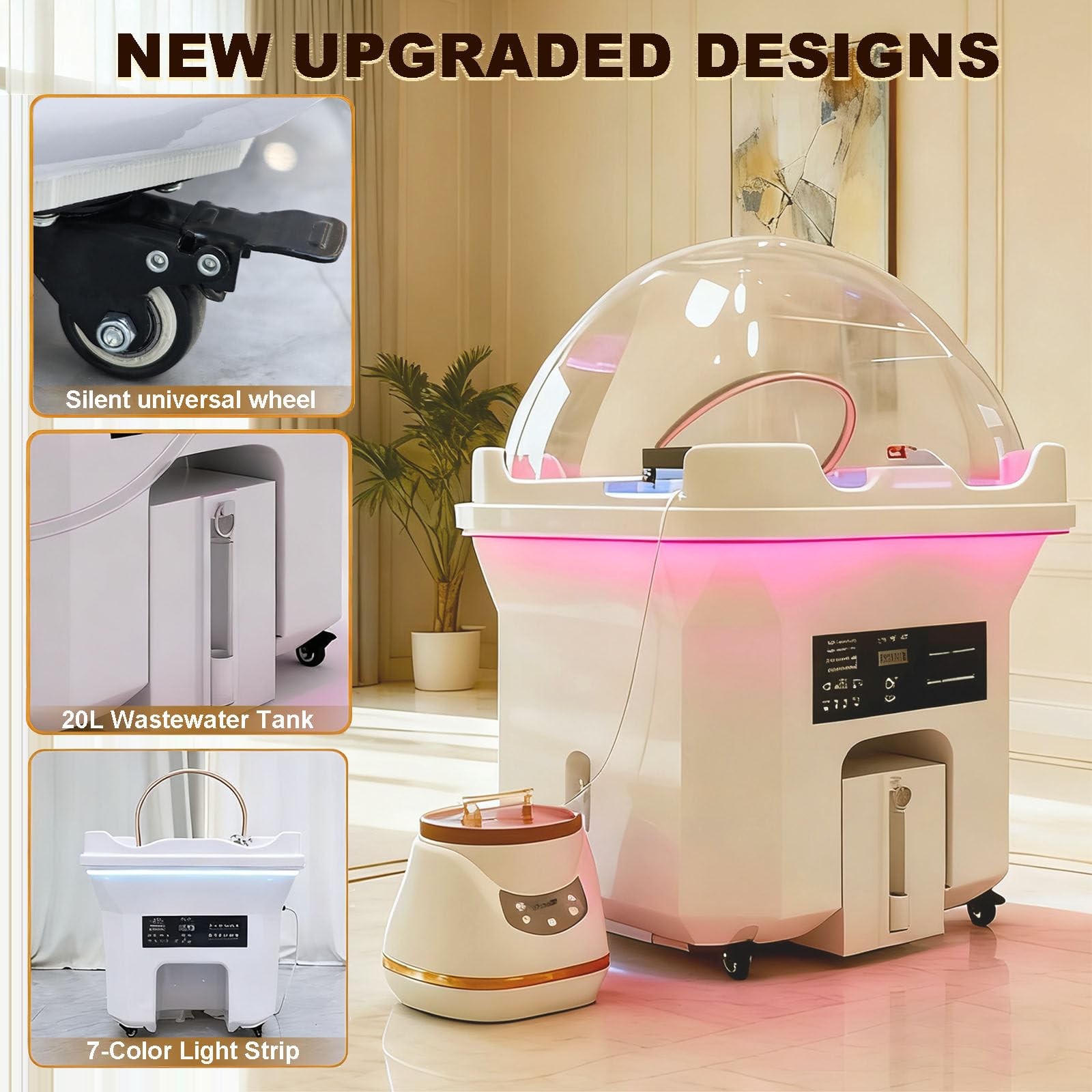 - ❤️ [CONCEPTION MOBILE AVEC LUMIÈRE D’AMBIANCE] Conçu pour une utilisation pratique, l’appareil est équipé de roues universelles verrouillables pour une mobilité fluide et sécurisée. Une bande lumineuse LED multicolore intégrée ajoute une ambiance stylée et apaisante à chaque traitement, rehaussant l’atmosphère globale du spa.