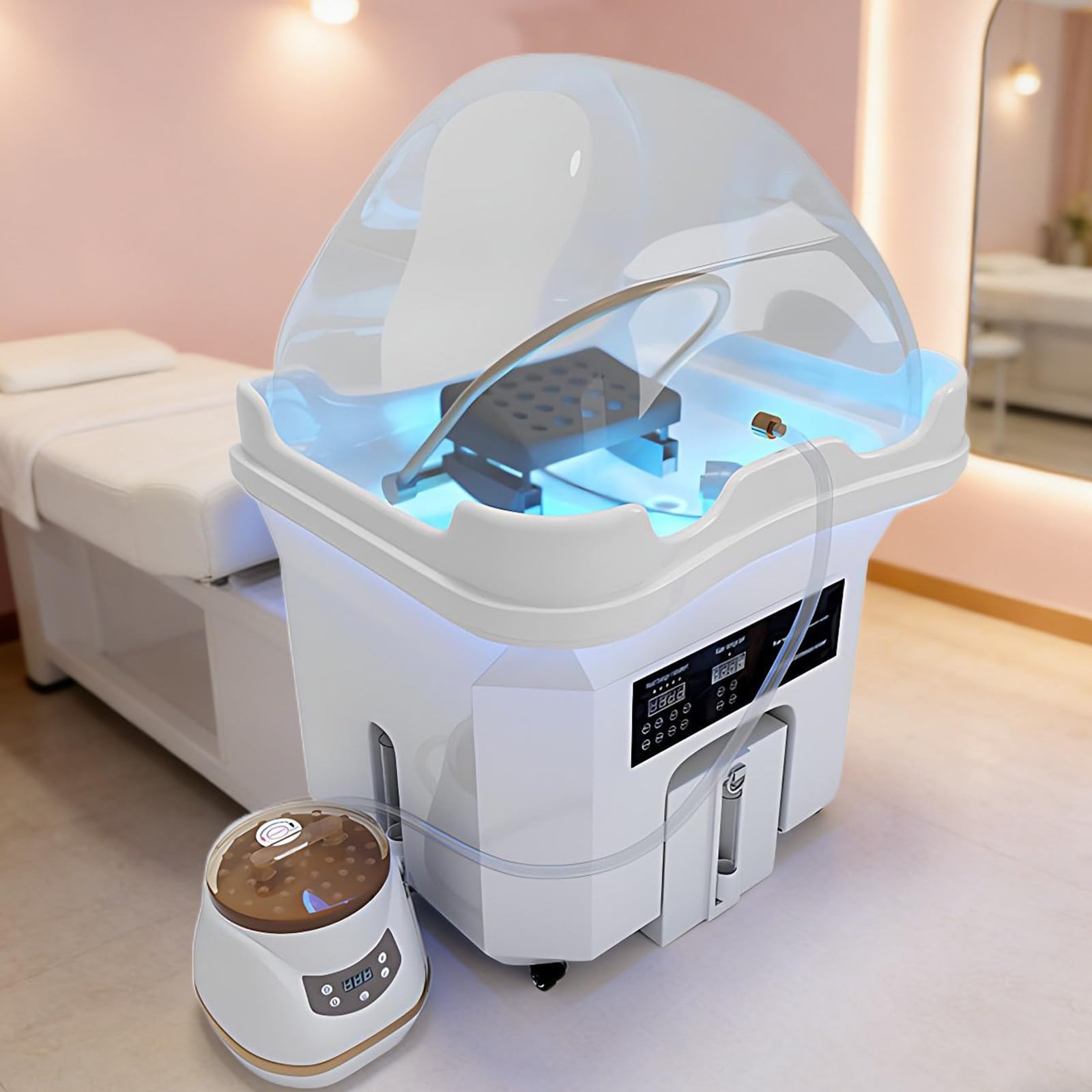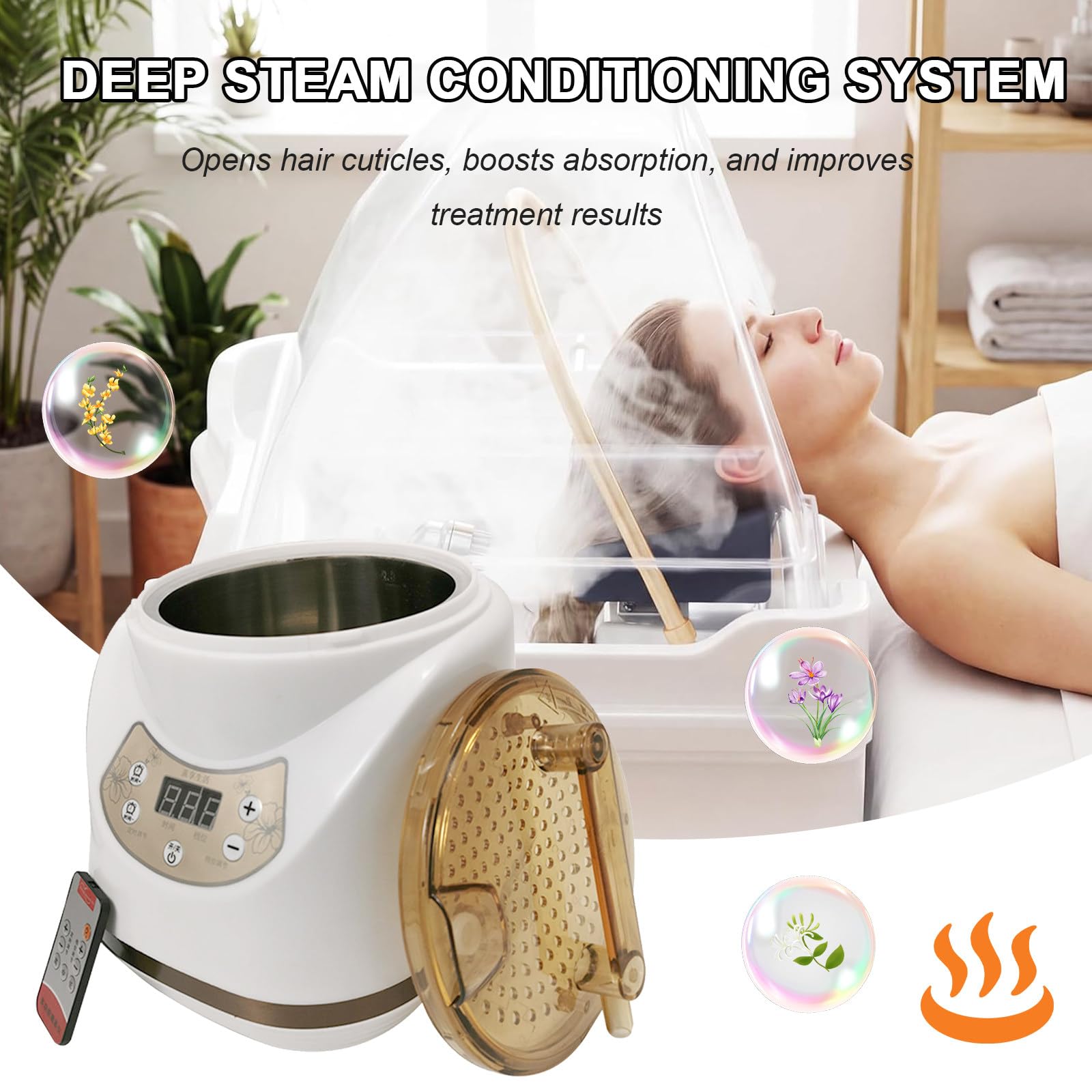 - 【Steam & Fumigation Therapy】This Japanese hair spa is a complete steam therapy system. It includes a tank, a steam generator and a fumigation hood that diffuses deep hot steam on the scalp. You can add herbal blends or scalp care essences to improve hydration, open pores, stimulate circulation and optimize your skincare experience.