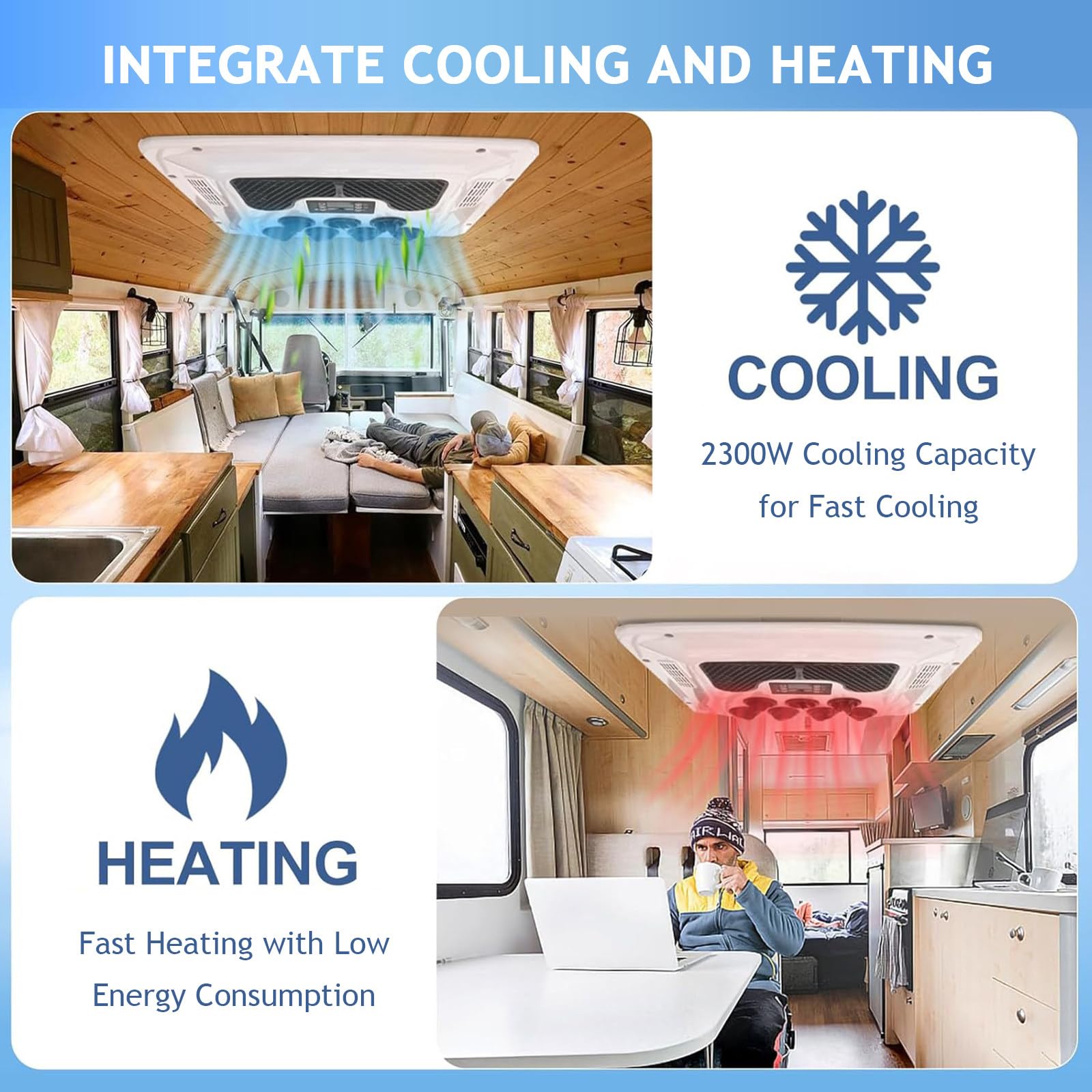 - 【Quick Cooling/Heating】This rooftop RV air conditioner has cooling and heating functions to meet your needs in hot summer and cold winter. With 8500BTU cooling capacity in summer, you can enjoy a cool atmosphere in just 8 minutes. With 4000BTU heating capacity in winter, you can feel comfortable warmth.