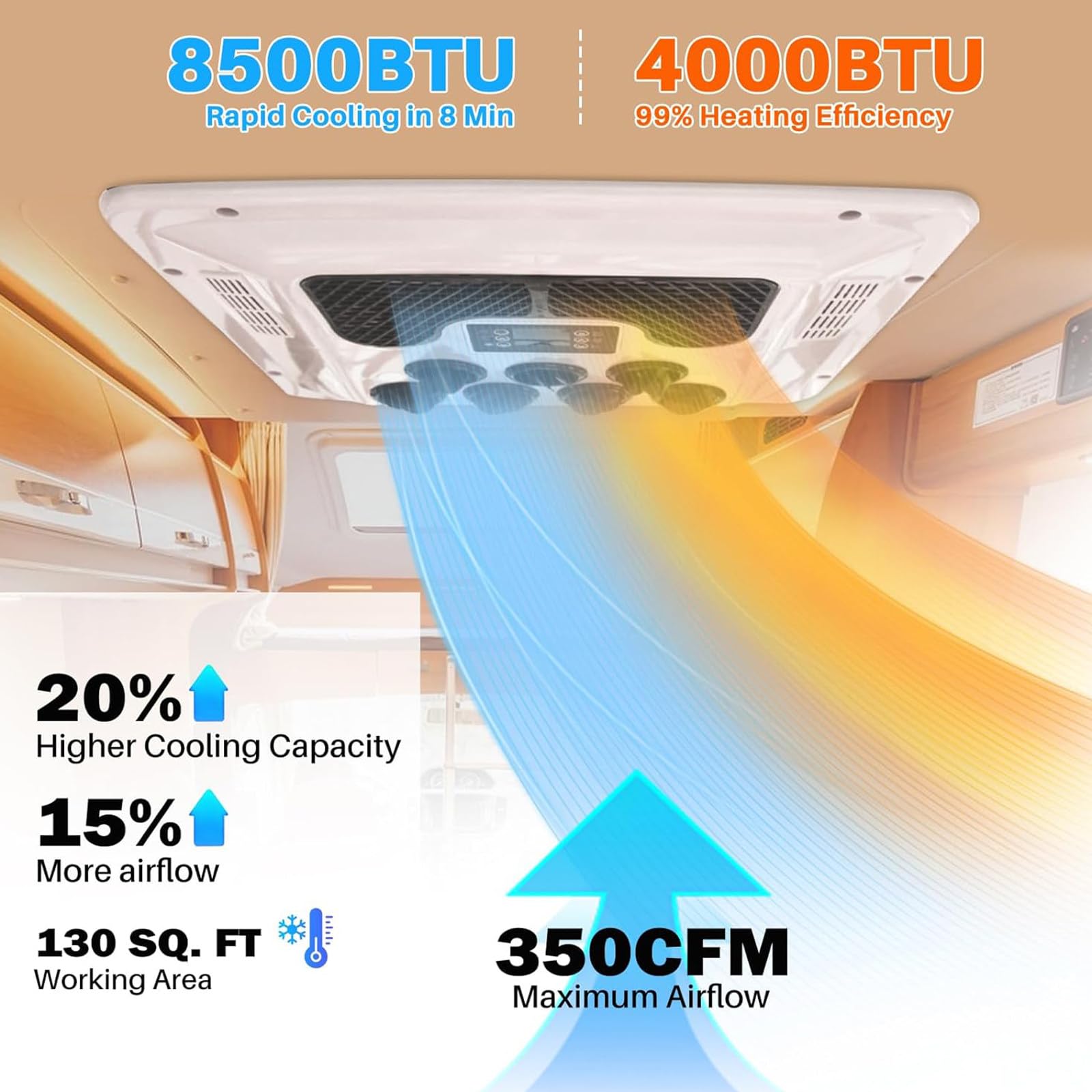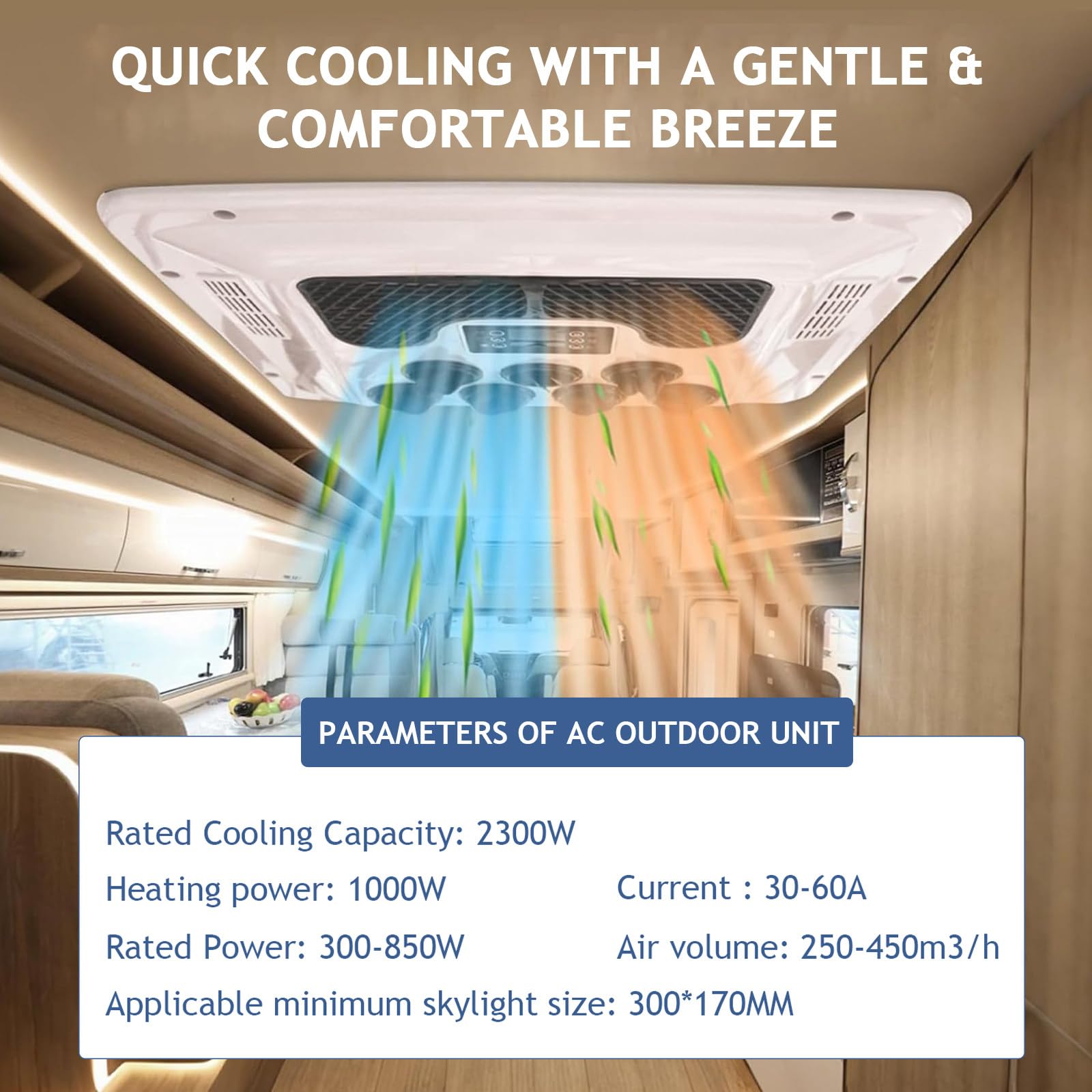 - 【Quick Cooling/Heating】This rooftop RV air conditioner has cooling and heating functions to meet your needs in hot summer and cold winter. With 8500BTU cooling capacity in summer, you can enjoy a cool atmosphere in just 8 minutes. With 4000BTU heating capacity in winter, you can feel comfortable warmth.