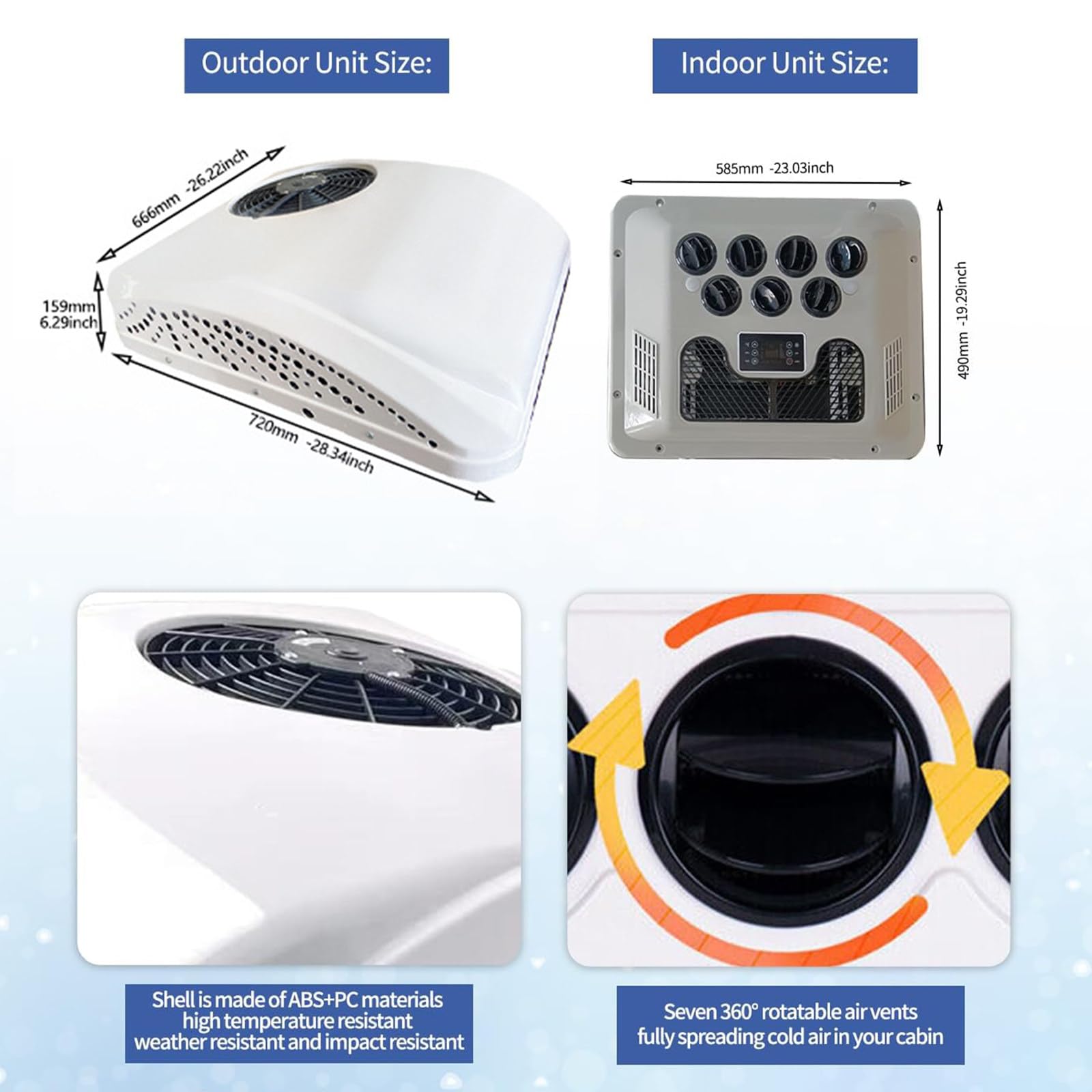 - 【High Quality】The caravan air conditioning unit with ultra-light ABS shell, high temperature and aging. New streamlined structure design, effectively reduce wind resistance. Intelligent main control panel, adjustable low voltage protection, can be adjusted according to your needs. Meet all your needs for caravan light truck air conditioning.