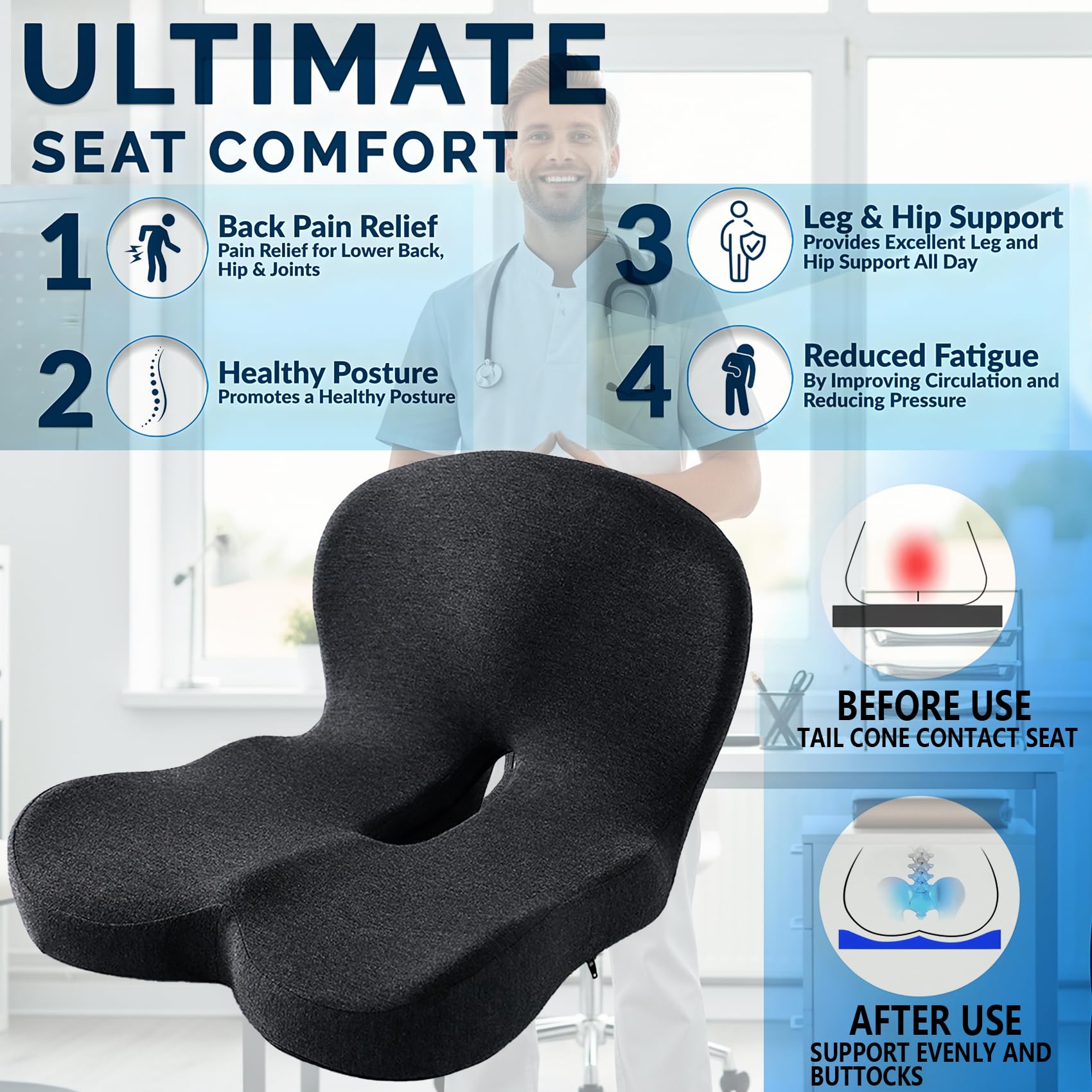 Memory Foam Seat Cushion for Truck Drivers, Office Chairs, Car Seats Ergonomic Chair Cushion, Sciatica & Tailbone Relief Ergonomic Pressure Relief Pad for Long Sitting (Black)
