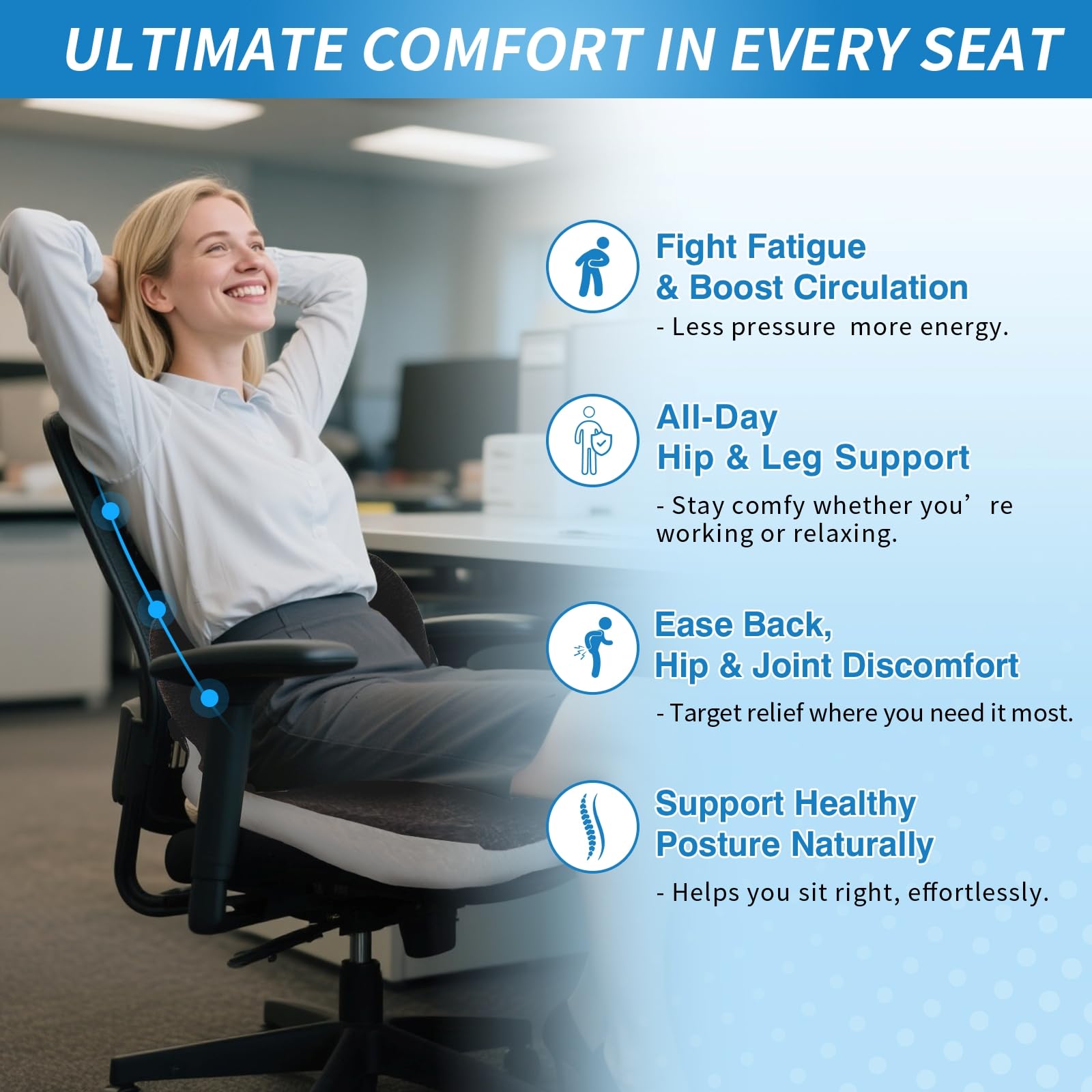 - Ergonomic Seat Cushion for Healthy Posture Alignment: Engineered as a postura seat cushion to promote proper spinal alignment, this ergonomic support reduces coccyx and sacrum pressure, alleviates sciatica and lower back pain, and encourages a natural S‑curve posture whether you’re seated in the office or behind the wheel.