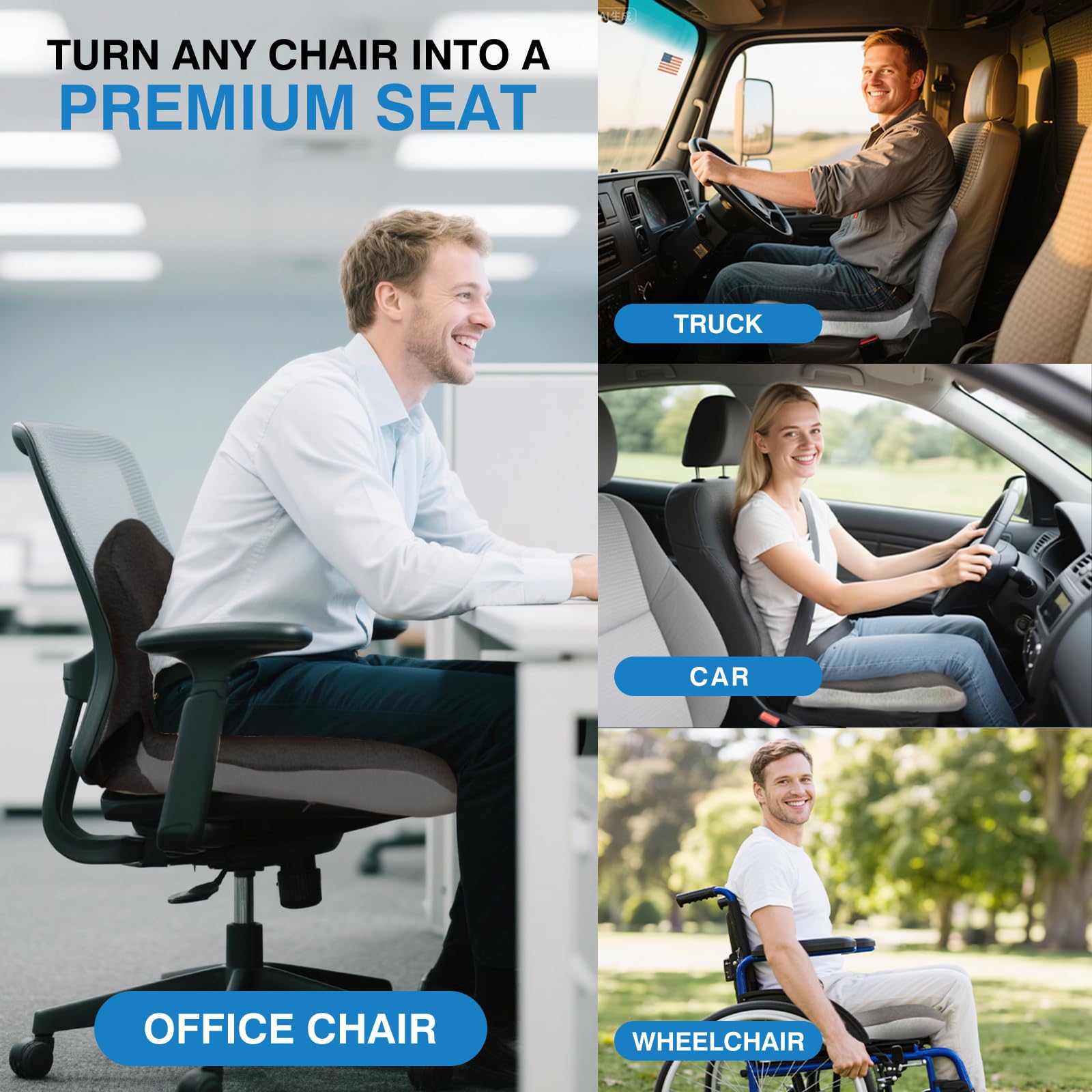 - Universal Truck & Driver Seat Cushion: Specifically sized for truck seat cushion and driver seat cushion applications , our cushion raises your seating position for improved visibility and safety. The high-density memory core delivers long‑lasting support, perfect for professional drivers or daily commuters.