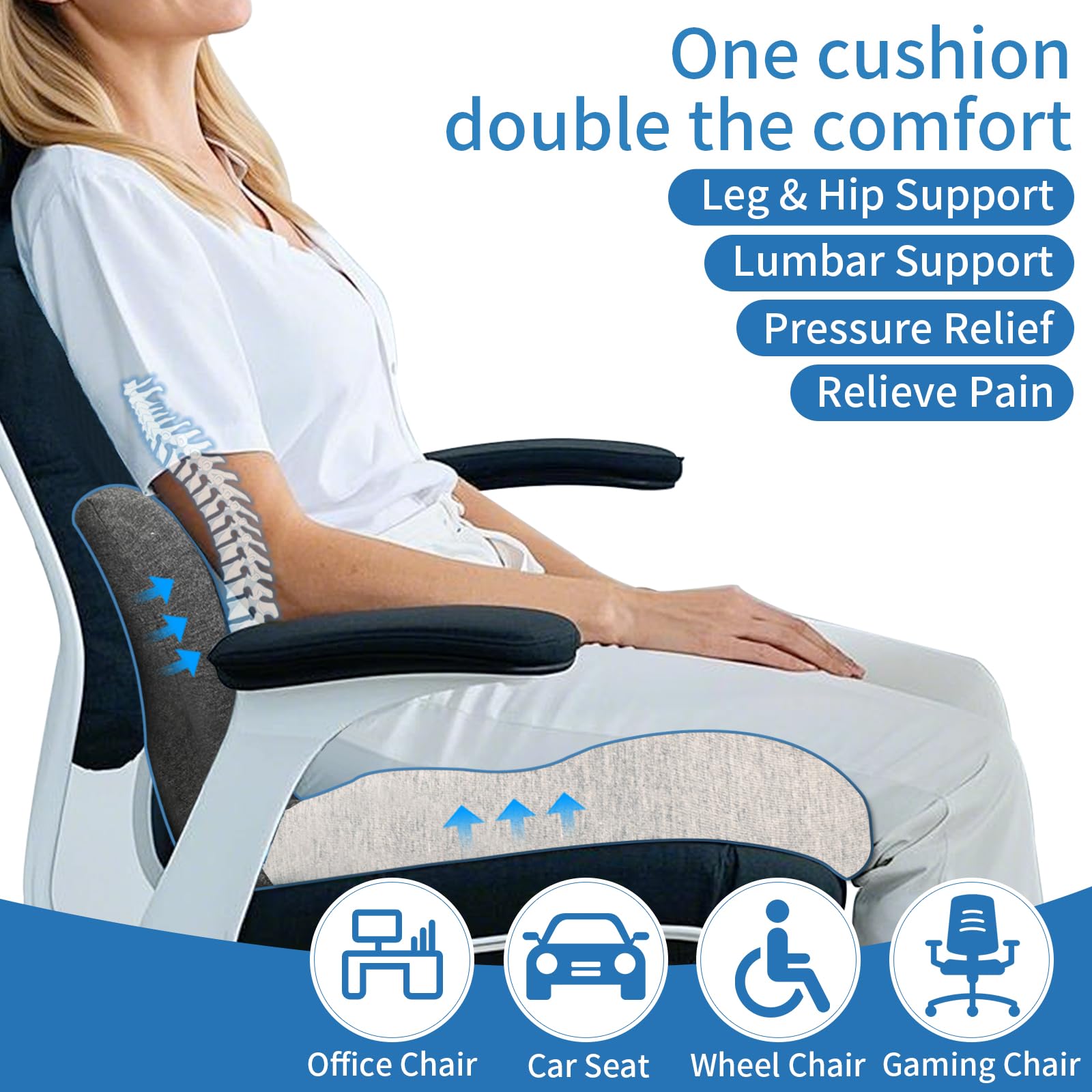• One Cushion, Double Comfort: Our uniquely molded one-piece design combines lumbar support and seat cushion comfort, offering comprehensive support that alleviates discomfort from prolonged sitting. Say goodbye to hip and lower back pain, including sciatica, and enjoy all-day comfort