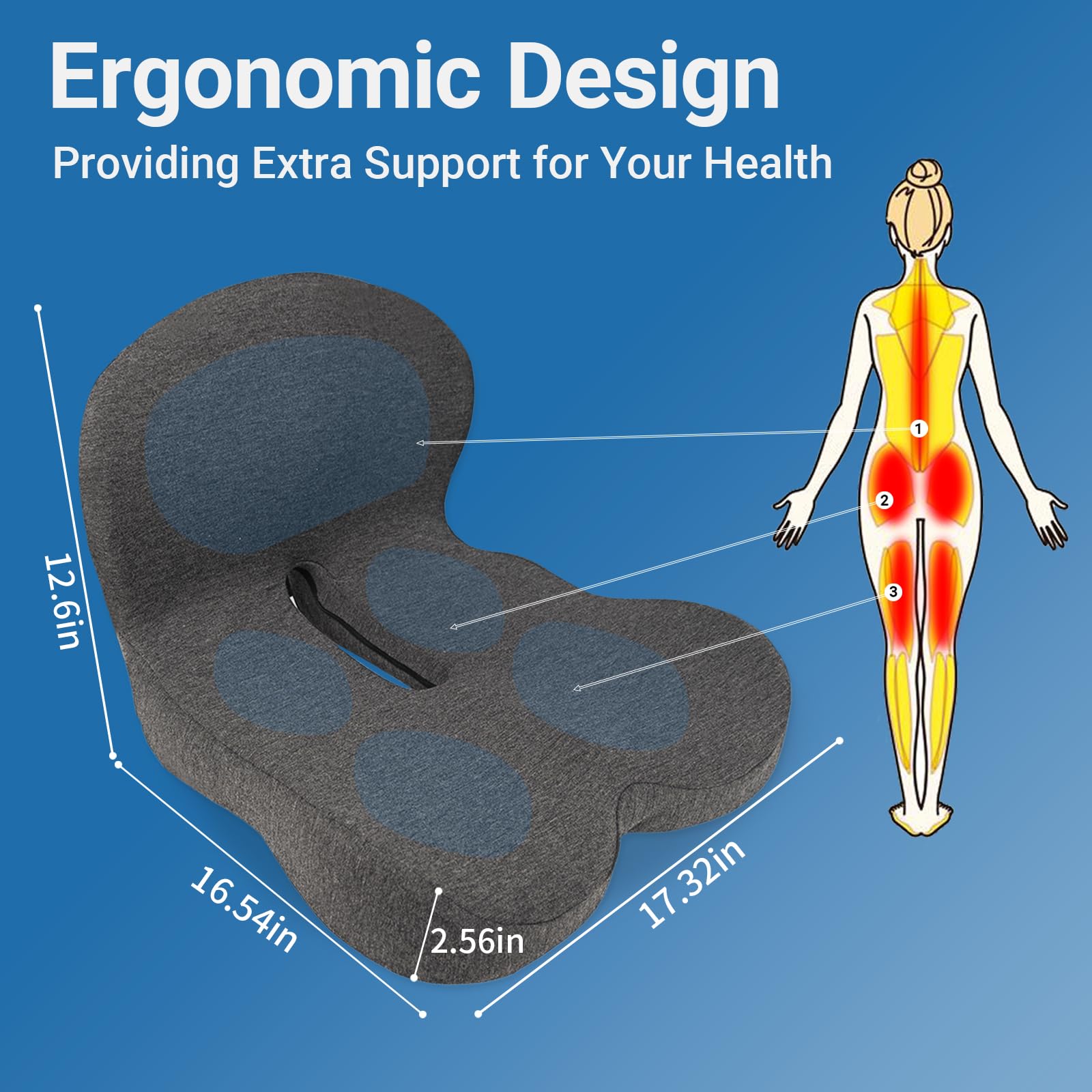 • One Cushion, Double Comfort: Our uniquely molded one-piece design combines lumbar support and seat cushion comfort, offering comprehensive support that alleviates discomfort from prolonged sitting. Say goodbye to hip and lower back pain, including sciatica, and enjoy all-day comfort